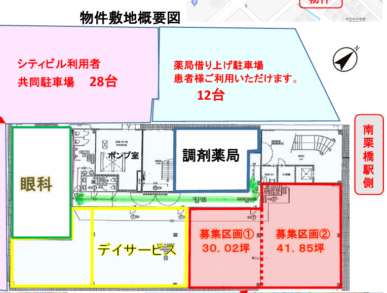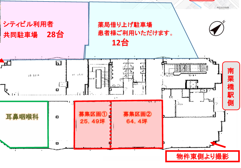 | 既テナント | 1階:調剤薬局、眼科開業済み盛業中 2階:耳鼻咽喉科開業済み盛業中 区画割は参考となります。分割利用可能のため広さについてはお問い合わせください。 |