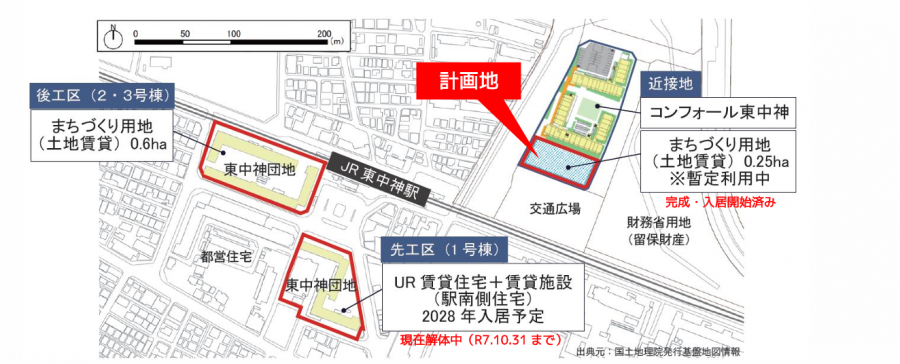 | 備考 | ■東中神駅周辺地区住宅市街地総合整備事業■ 独立行政法人都市再生機構の【東中神駅周辺地区住宅市街地総合整備 事業(拠点開発型)】として令和2年から進めている事業。 2024年に「コンフォール東中神」が竣工、旧住宅の住民が移動し現 在は1号棟を解体中、新住宅完成後に2・3号棟の居住者を移動後、ま ちづくり用地に整備し、周辺一帯は立川基地跡地昭島地区土地区画整 理事業と併せて今後17~8年まちづくり事業が継続される予定です。 |