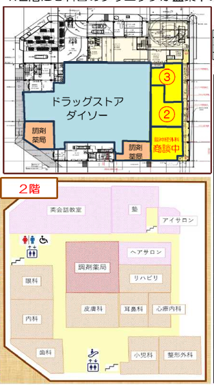 | 既テナント | 1階:ドラッグストア 2階:調剤薬局、学習塾、美容室 内科、眼科、歯科、皮膚科、耳鼻科、心療内科、小児科、整形外科等 募集科目:在宅診療所や透析診療所も可 |