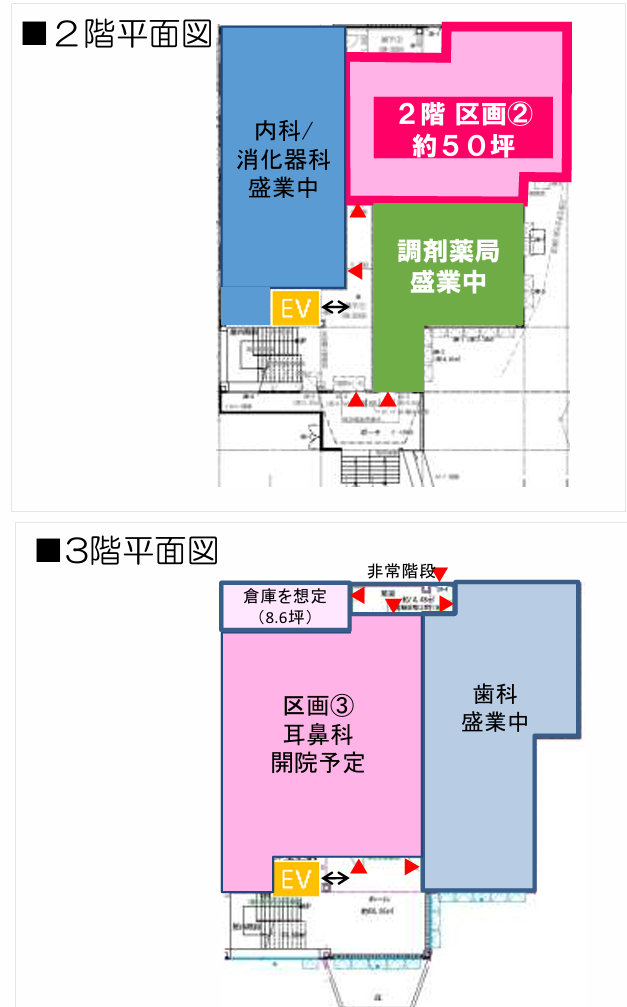 | 既テナント | 1階:駐車場42台 2階:調剤薬局、内科開業済み 3階:歯科開業済み 耳鼻科開院予定 残り1区画 |
