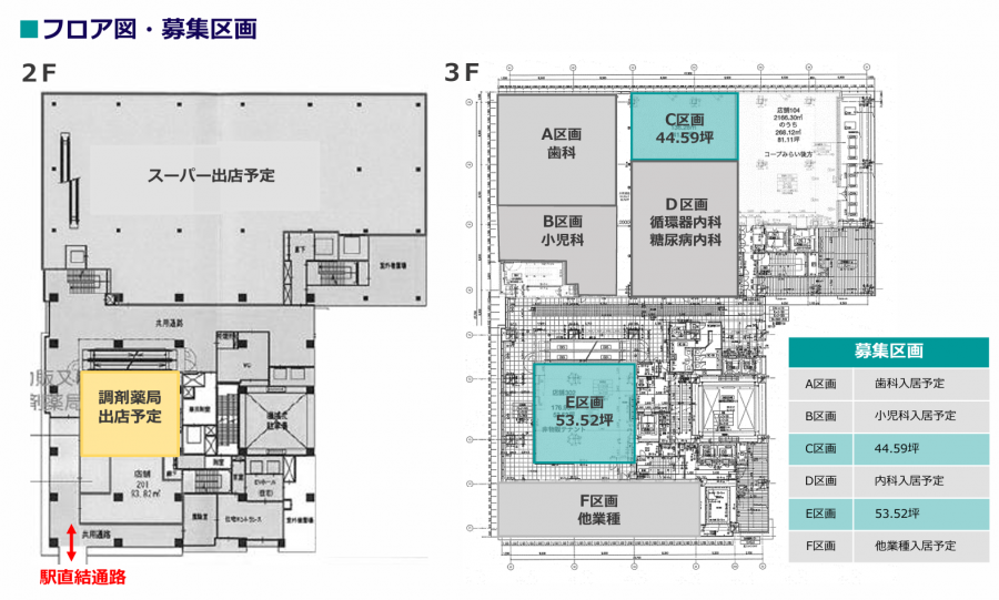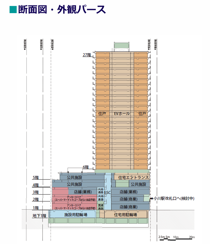 | 既テナント | 2階:調剤薬局予定 1階及び2階 商業店舗 3階:内科、小児科、歯科内定済み 4階及び5階 公共施設 6階以上 住居予定(上階27階) |
